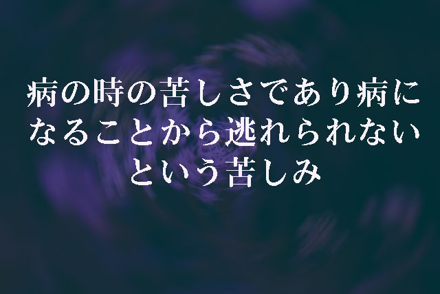 病の時の苦しさであり病になることから逃れられないという苦しみが仏教上の四苦八苦の病苦(びょうく)である。